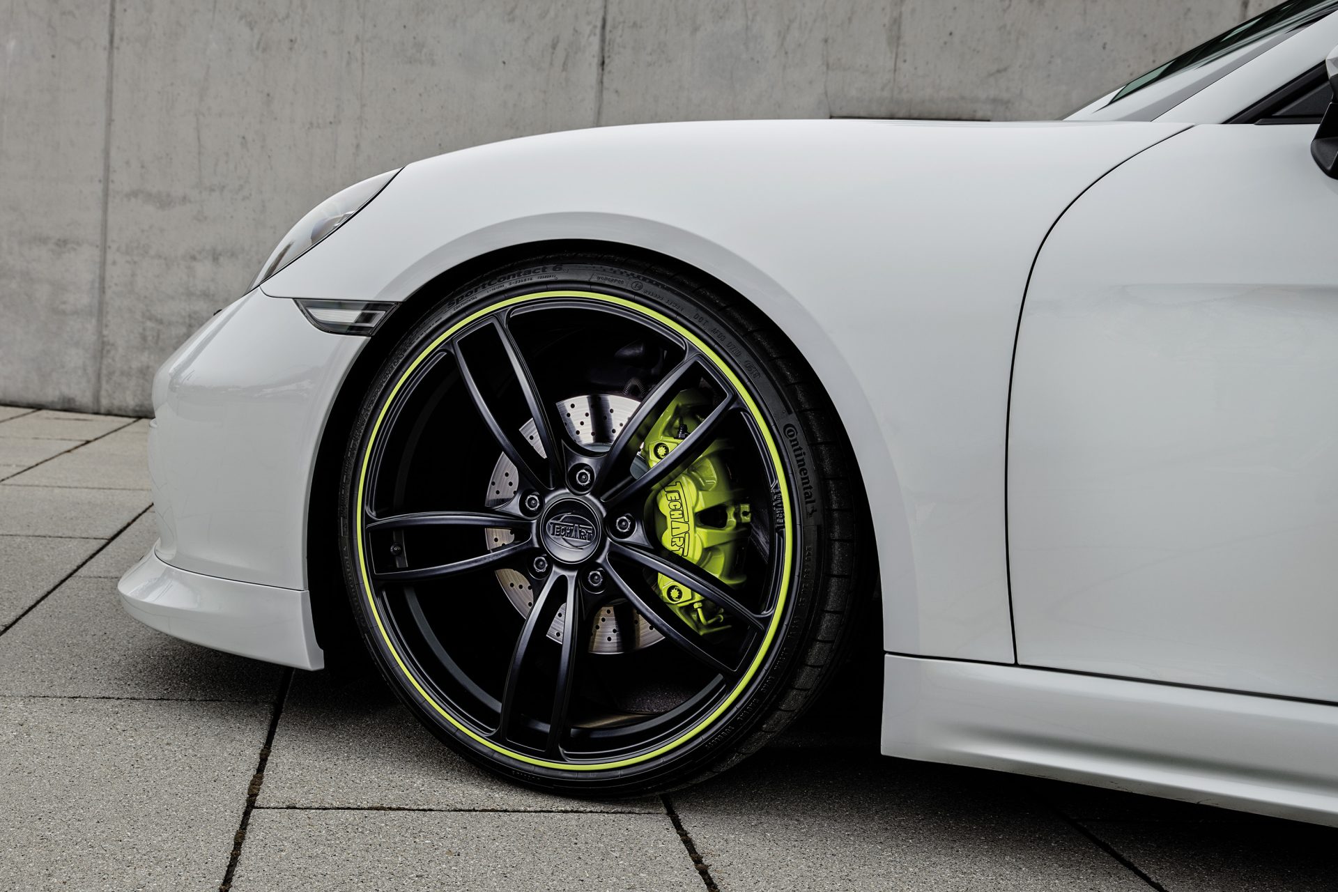 Modyfikacje nadwozia i kół TECHART stawiają dynamikę jazdy 718 w centrum uwagi. Sprężyny TECHART obniżające o 30mm i progresywnie zbalansowane zapewniają bezpośrednie i sportowe prowadzenie.
